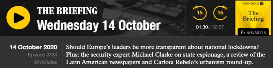 Wednesday 14 October 2020 Episode 2334 (30 minutes) can be found here: https://monocle.com/radio/shows/the-briefing/2334/transparency-and-coronavirus/